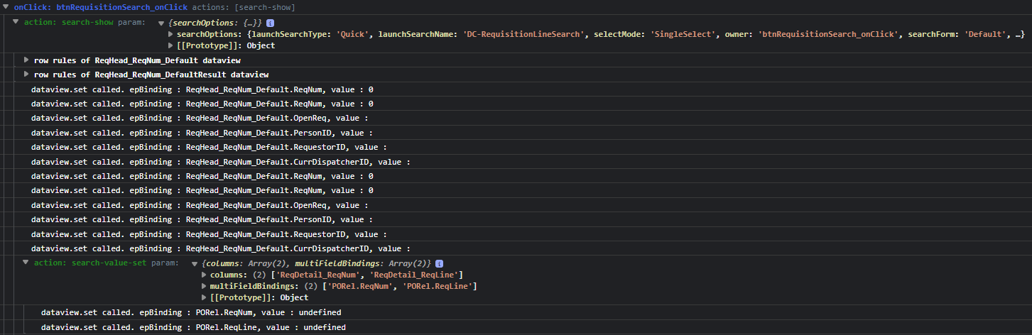 The search appears correctly, the Quick Search displays as expected, but when a search result is chosen and the user clicks OK, ‘undefined’ values are applied to the fields I am attempting to update (PORel.ReqNum and PORel.ReqLine).