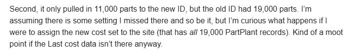 We just moved a separate company to a site in our instance. When I was doing tests, I originally didn’t update the cost ID, and we are 100% FIFO. After the fact, I found the results were all messed up. This means costs from one site got removed as we did transactions at the other site.
