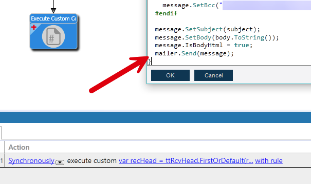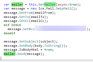 C# to send an email. Go through a bunch of code to build the email, then send it like this. It’s being set synchronously because of bad experiences with async processes in the past (which admittedly may or may not be a problem anymore)