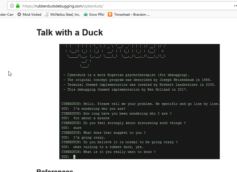 If you don’t have a rubber duck, the site has a chat bot do you can talk to something, (like a rubber duck). lol