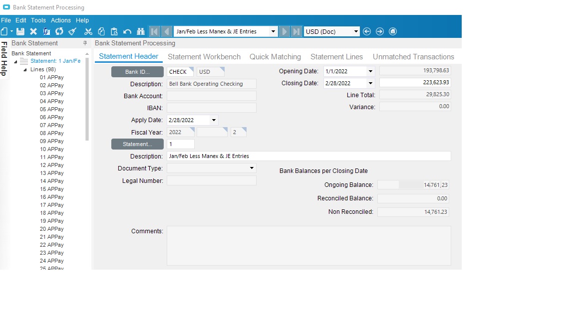 Hello,I am new to using Epicor and didn’t get all the training I should have. Can anyone help me understand what the numbers mean that are on the statement header in the bank statement processing module? Specifically, I don’t know what the Ongoing Balance and the Non Reconciled boxes are supposed to represent. They don’t seem to match what I would assume they mean. Shouldn’t the Non Reconciled amount equal the unmatched transactions? Shouldn’t the Ongoing Balance mean the amount of money left in the account? I appreciate any help I can get!