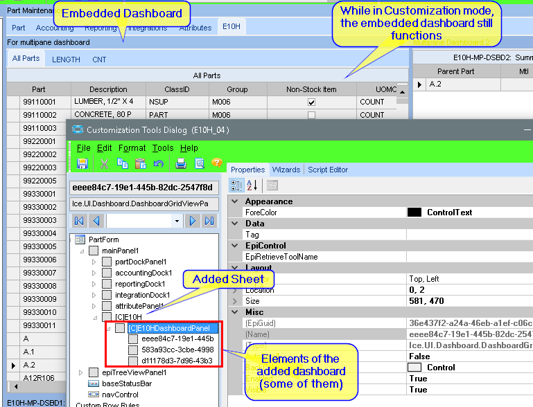 I tried to see if customizing the form that you inserted the dashboard (via Sheet Wiz), would allow elements of the dashboard to be referenced (and controlled) by the parent form. Turns out that even while in Customization mode of the parent form, the embedded dashboard still runs like normal.