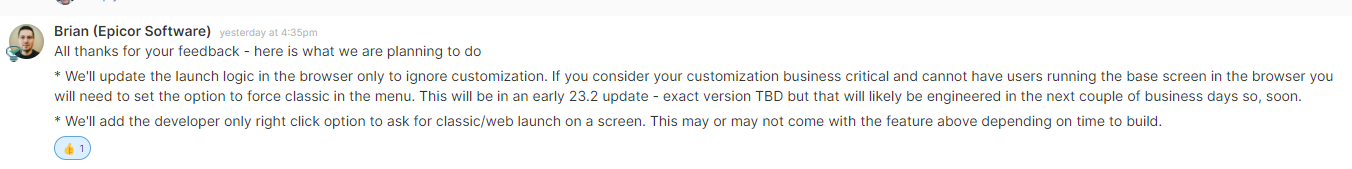 My chief complaint to Epicor on this was that if you have classic customization and classic is then forced, uplifting is a paint because you have to create new menu items or remove your classic customization to get to the browser version.
