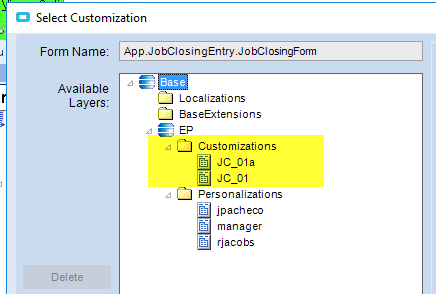 Our test server is a 10.1.600 upgraded to 10.2.400. Our Job Closing form was the base form from 10.1.600 and I saved two customizations in 10.2.400 and the only customization that showed up in the drop down menu was the customization checked for All Companies. Not sure if that is what you’re seeing.