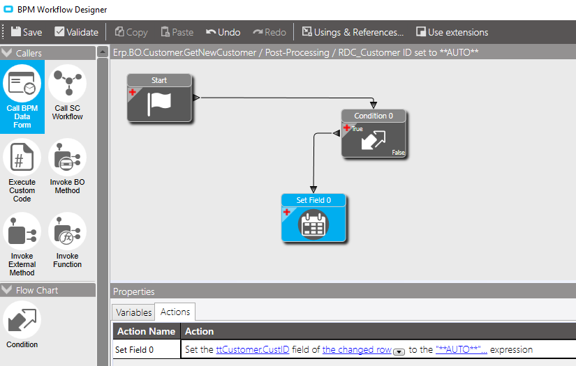 The first Post Processing Directive above is based on the GetNewCustomer BO simply fills the ID field in a newly inserted record with the text “AUTO” and the second Pre-Processing directive with custom C# code below is based on the Customer.Update BO does all the heavy lifting of allocating and updating the Customer ID once the Customer name has been entered.