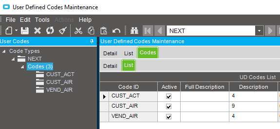 To explain, I wanted a method to generate unique ID’s based solely on the customer name entered made in the format AAA999 where AAA denotes the first few characters of the Customer name and the 999 is an incremental number starting at 001 for every AAA entered.After research I decided to use the UDCodes table to hold an index of all the AAA values and an associated “Next” 999 number (Held in the Description field of the UDCodes table). All the UDCodes are held under a CodeType field of “NEXT” with a code of either “CUST_” or “VEND_” depending on the ID field being generated. An example of how the UDCodes table looks is as follows: