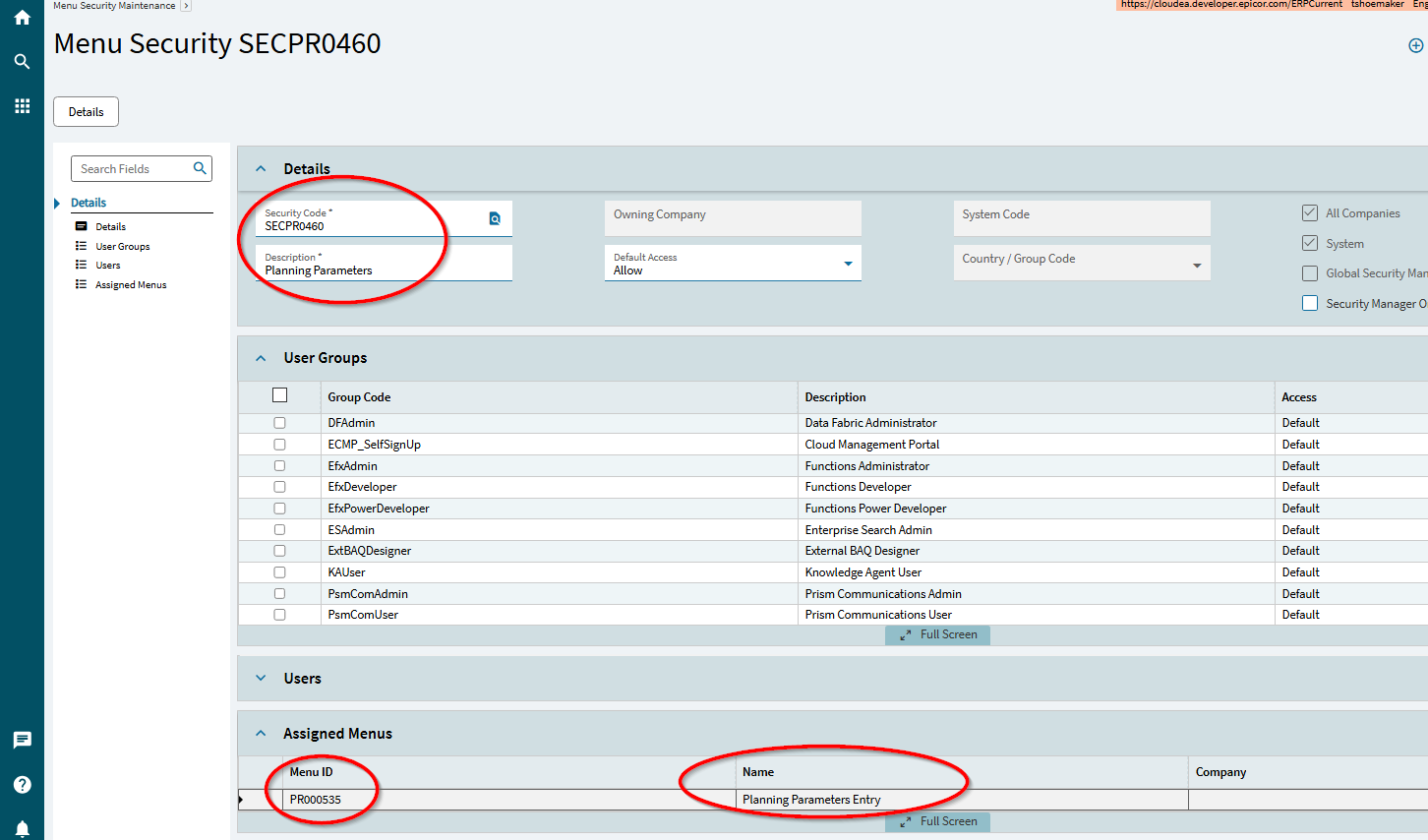 There is a special security group called SECPRO460 called “Planning Parameters”… it is associated with the menu option for “Planning Parameters Entry” which is what is executed when you choose that option in the Time Phased Inquiry.