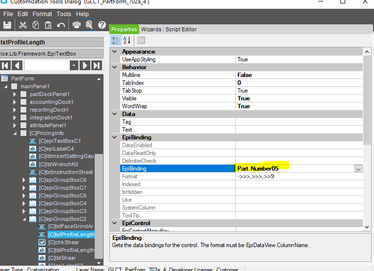 I added a new Part_UD column, Number 06, and it is not showing up in the EpiBinding field. I’ve regenerated the data model and see it when I open the part_ud table in the data dictionary.