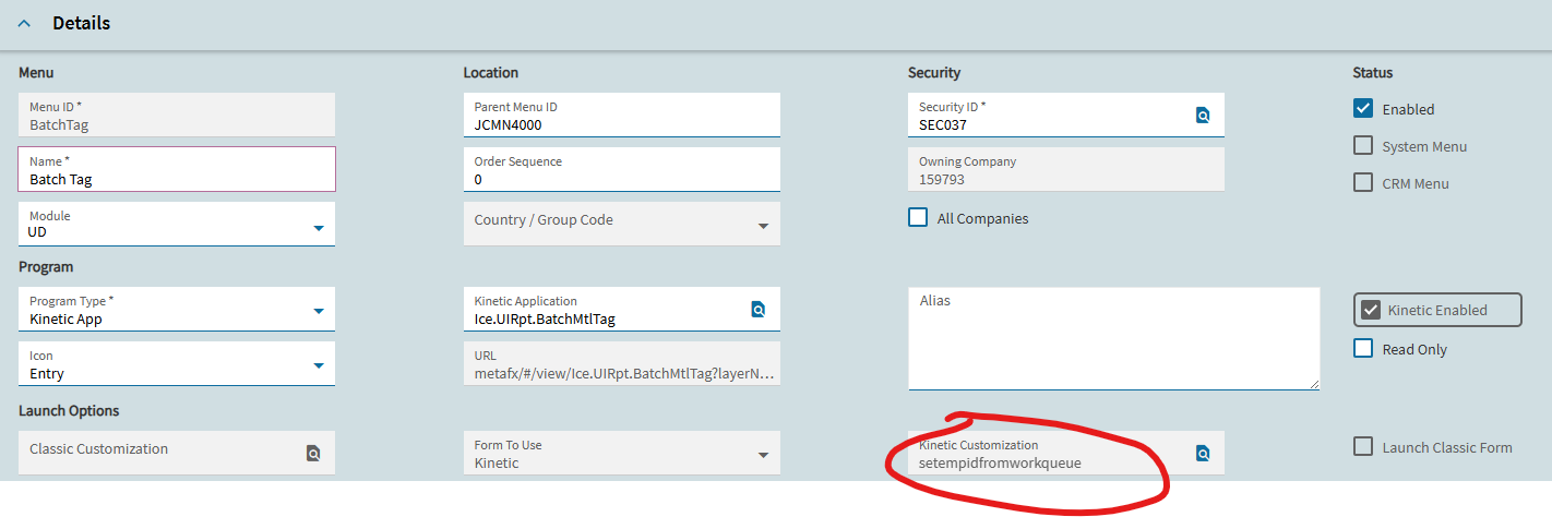 When the “View” Property is set to a “Menu ID” and the “Layer” field is set to a Kinetic Customization Layer, Kinetic will now verify if the Menu ID Exists. If the user has Menu Security access to that Menu ID, and if the Kinetic Customization Layer is deployed to that Menu ID, adding the “Layer” field in the App-Open widget is no longer needed. The layer is defined in the Menu Item record.