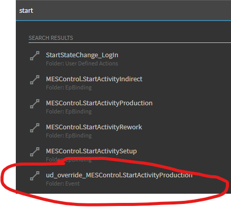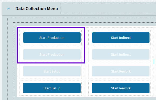 So, notice, if I unhide in my MES layer, I’ll see the base Start Production button is dimmed. My custom button is the one tied to my custom Start Production event with my layer applied.