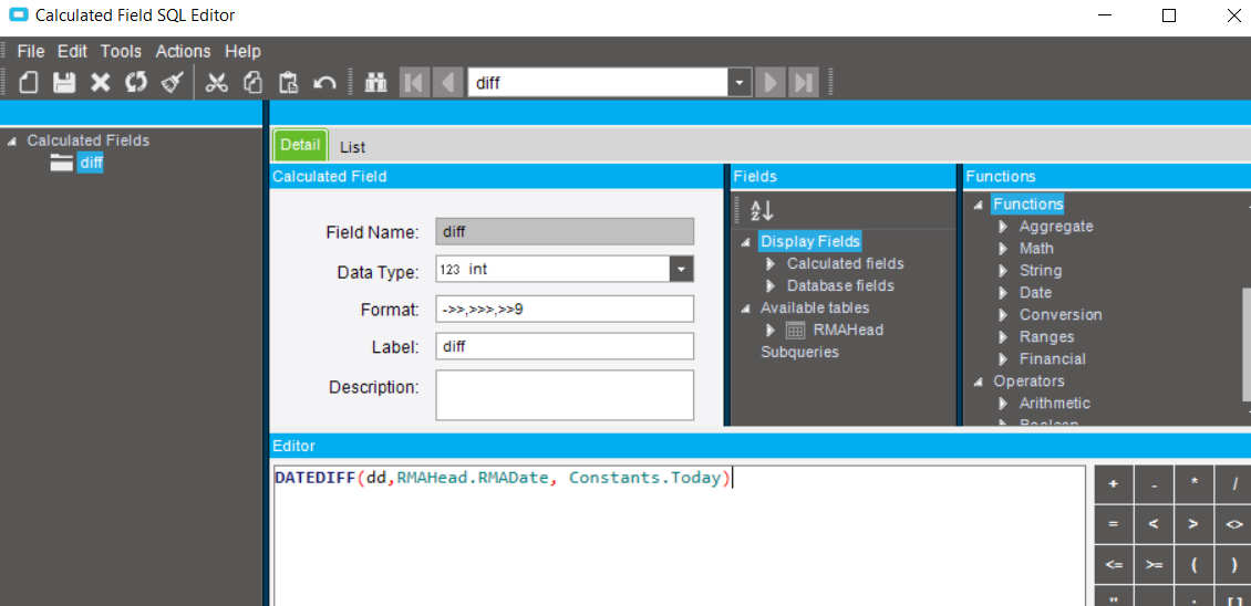 “datediff(dd, RMAHead.RMADate, Constants.Today).” When I do I get “Operand data type date is invalid for subtract operator.”