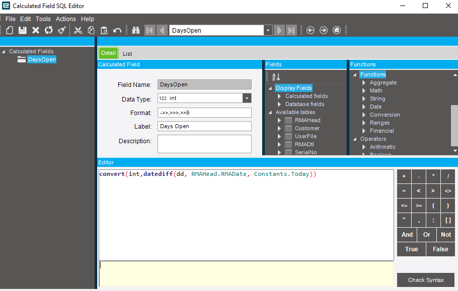 I removed the last changes to the RMA to go back to a “last known good” configuration and I was getting no data returned. I had a backup from that point so I deleted the current version and copied the backup to create a new version. I added the calculated field using “datediff(day, RMAHead.RMADate, Constants.Today)” and it works perfectly.