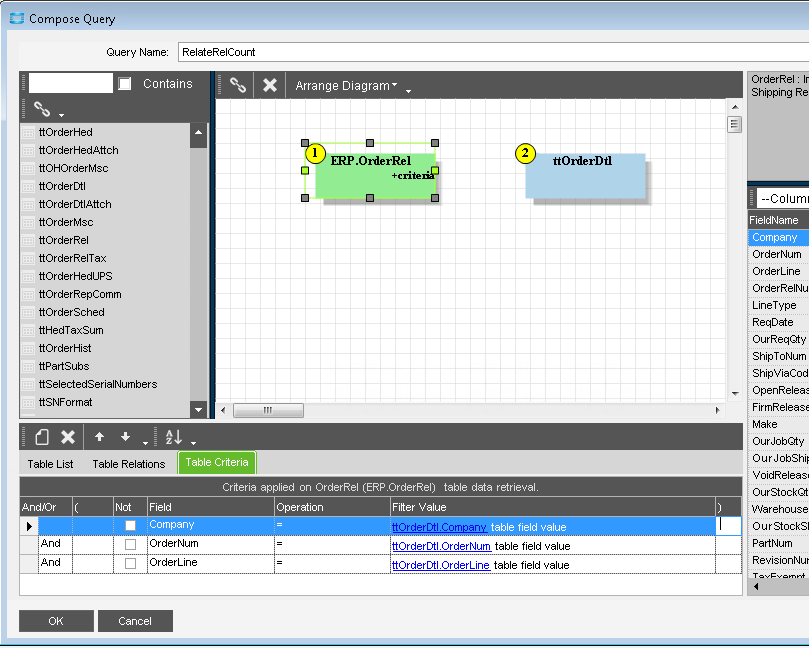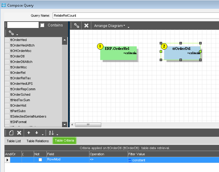 This is not intuitive as the two tables are not connected in the diagram and the “target” table, ERP.OrderRel, does not have a queryable RowMod value. I suppose that using the ttOrderDtl criteria to limit the tt rows is somehow affecting the row count produced by the table criteria.