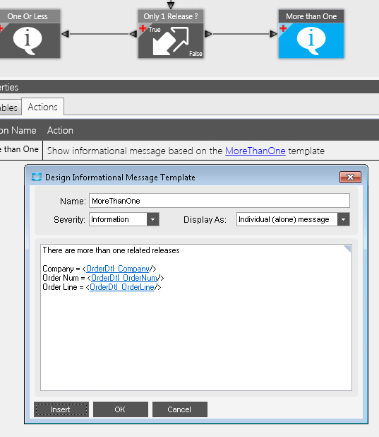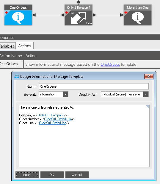 I have simplified an example of an issue I am seeing with a BPM. I am using the Number of Rows in the < x > query… condition to determine if a Sales Order Line has more than one release. Here is what is happening: