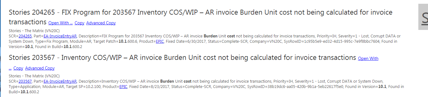 So we have odd issue where the InvoiceDtl table doesn’t match the GL transaction. For some reason the InvcDtl shows $0 for all of the burden costs, but if you look at the GLtransaction tracker for that transaction, the burden shows as $22.61. I don’t get how they could be different… For other parts at least one of the burden amounts in the InvoiceDtl matches the GLtransaction. There seems to be a few problem parts. Has anyone else ever seen this before?