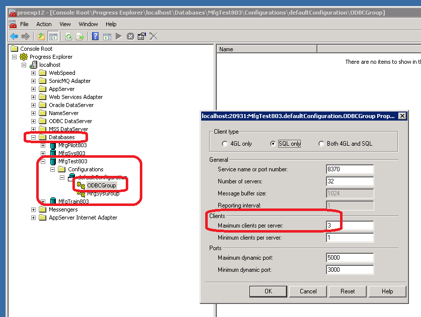 Look below; navigate to your live DB (mine is TEST) and drill down to ODBCGroup and right click on it, Properties and modify my circled value to something higher. Restart your appservers and db to apply.