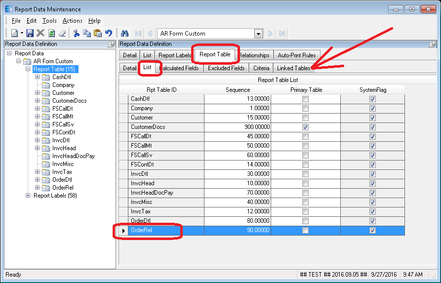 In Linked Tables, in the left column “Lookup Available” choose “OrderNum” which is a bad way to say you are selecting the OrderHed table. Once it is in the right column, “Lookup Picked” press SAVE. You must press SAVE. (bug). Then…