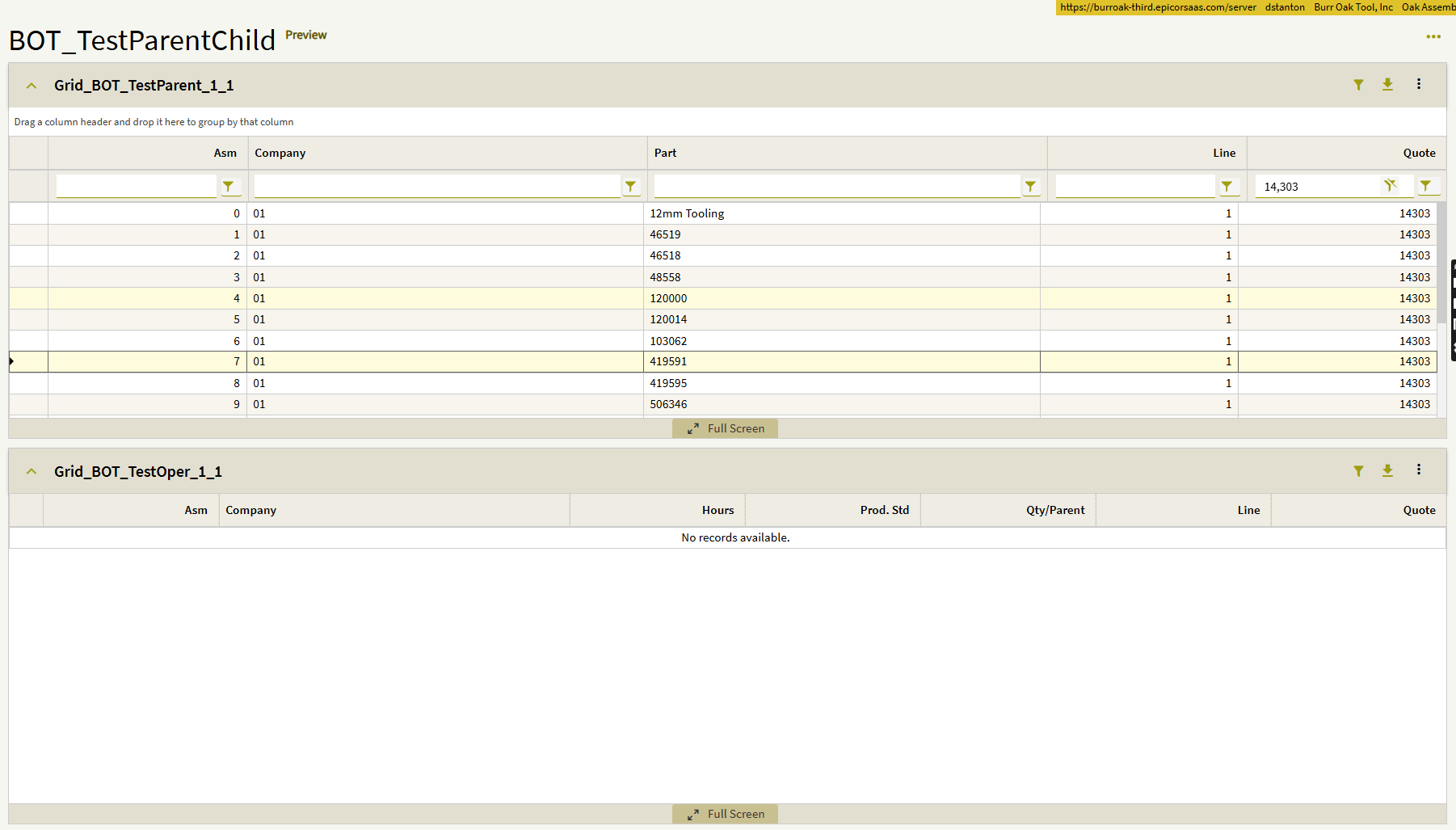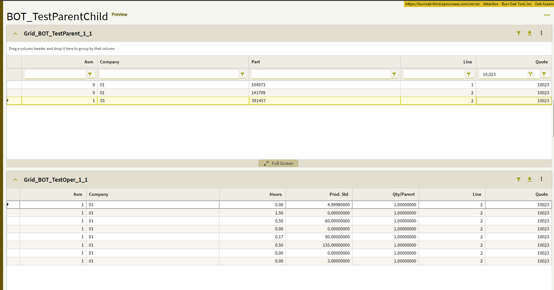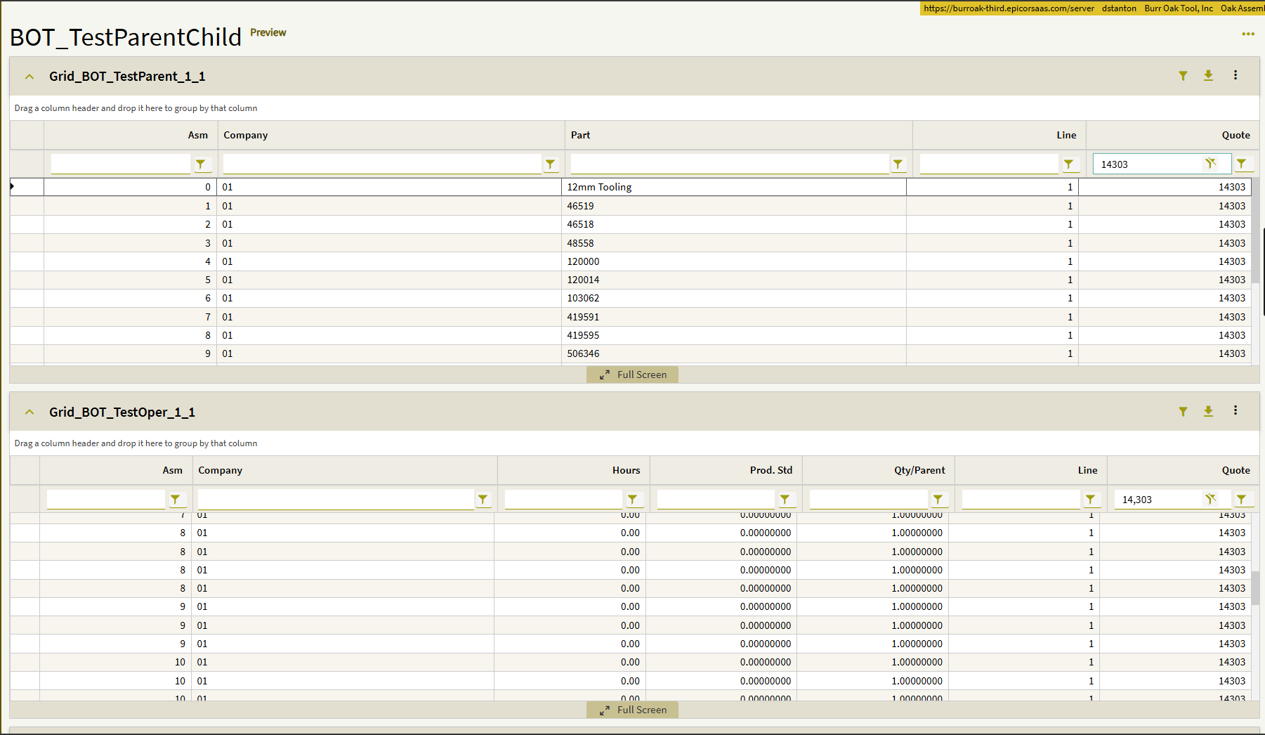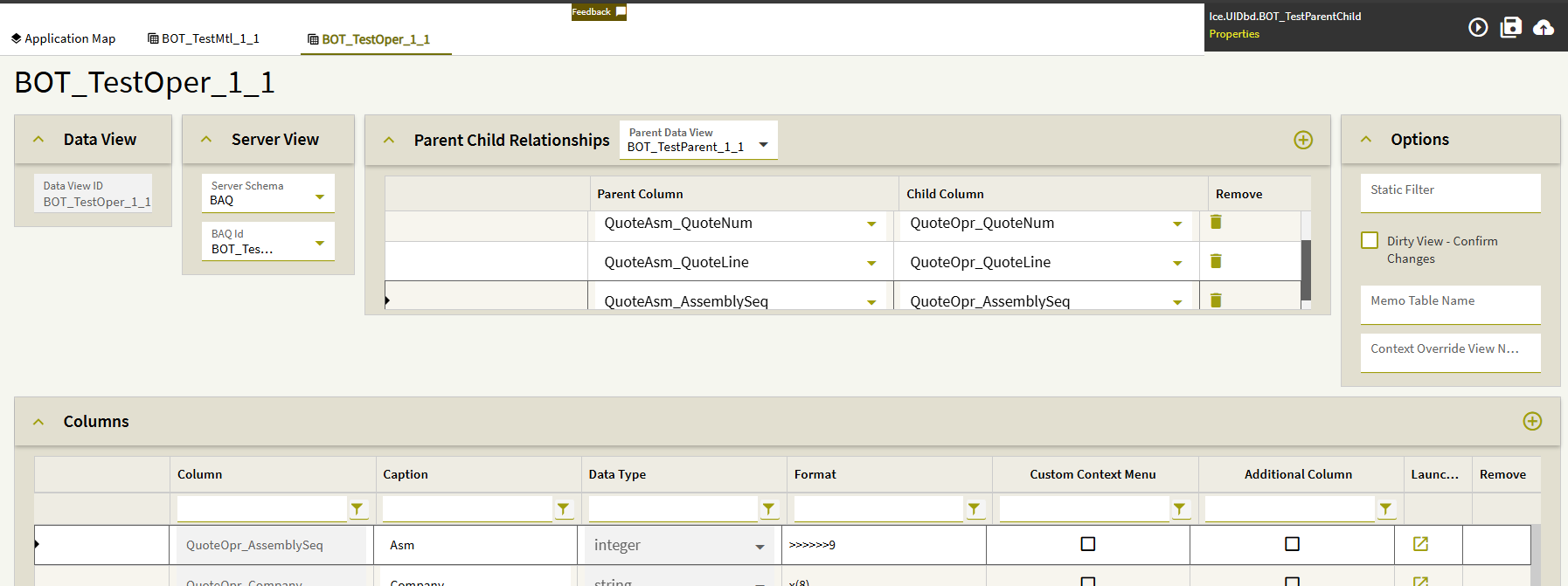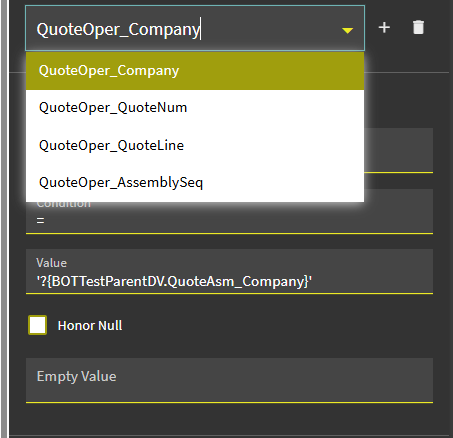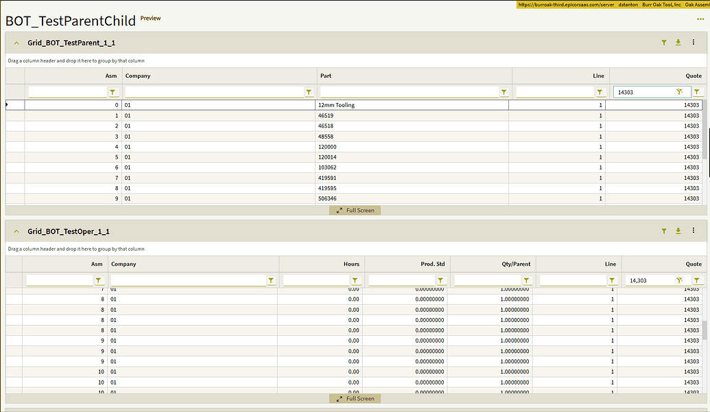 Here is a screenshot showing the relationship between QuoteAsm and QuoteOper (Company is also included, but I couldn’t fit all four columns in the screenshot):