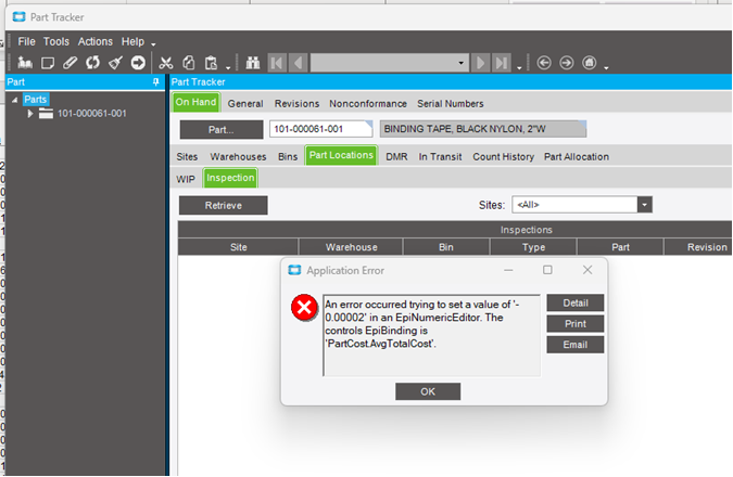 We have a Part which has somehow gotten an Extended cost of -0.00002 and we cannot correct because anyy timie you access the record an error pops up…at times locking Epicor up completely. Any ideas how to fix?