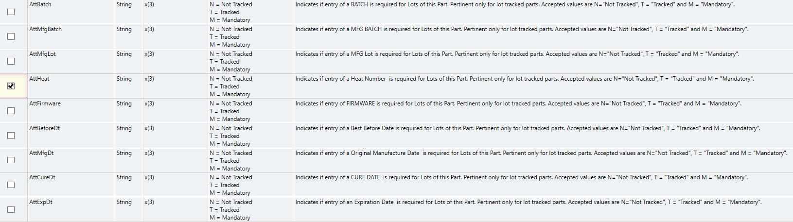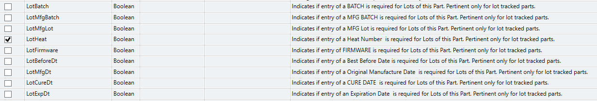 For example, Part.AttHeat is on the Part Entry UI but we don’t see where Part.LotHeat gets used. Part.LotHeat appears to be false in all cases, irrespective of the value of Part.AttHeat.