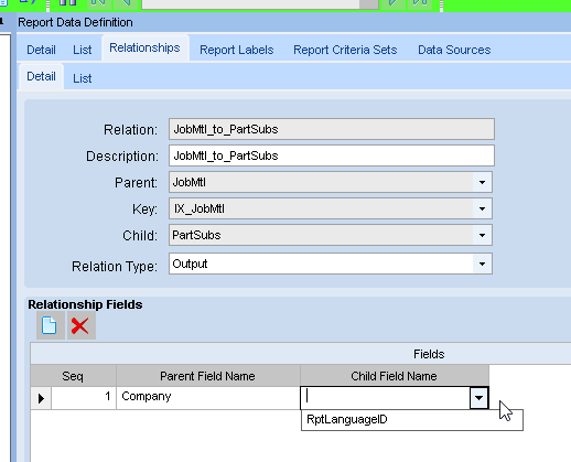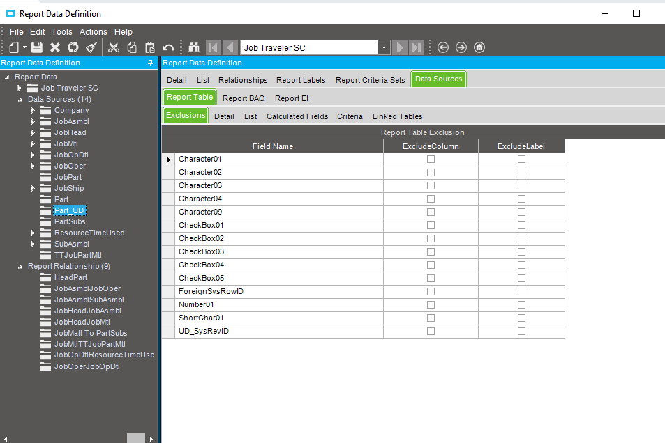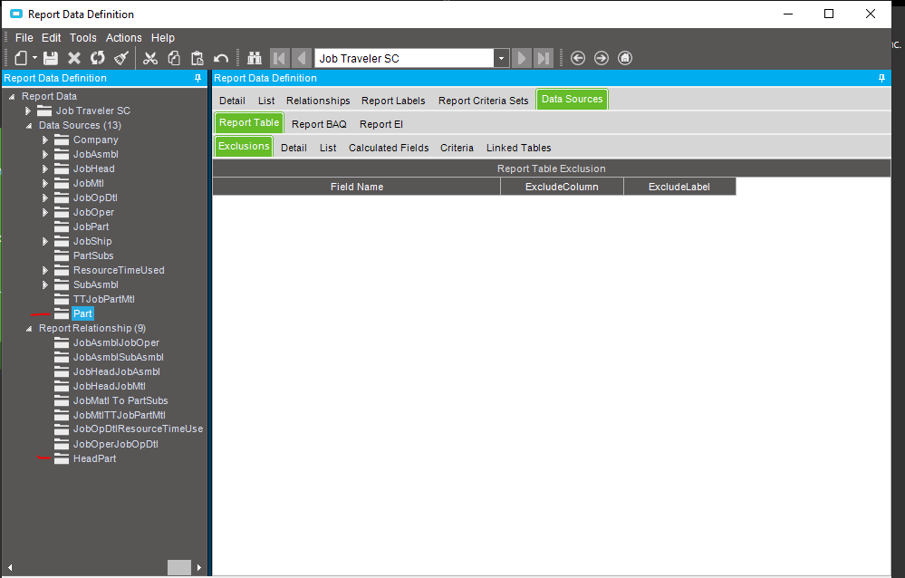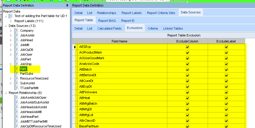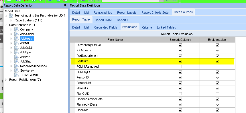 The PartSub was to get the list of Alternate parts to print in the BOM. I am trying to show the Character09 firled for the part that is being made on the job (so linked to the Job Header). I added the Part table and linked it to the job header but there are no fields in the Exclusions tab. I expected this to populate so I could chose the field I needed.