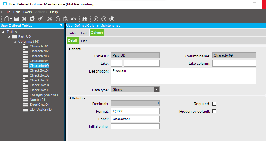 I’ve looked at the new parts in a BAQ and can see the correct program filling the Character09 field, just like the old parts (this is making me so frustrated I didn’t think of doing that in the first place). I printed an old job from 2018 that is still open and it is showing a different program than the one showing in the Character09 box in the BAQ and Part Master. The report is using the expression Fields!PartNum_Character09.Value. One thing I did notice is the UD Column Maintenance Says Table Not Synced. Maybe things have gotten crossed and syncing would fix it. Can I do that while people are using Epicor or should I schedule it for a time when no one is working?