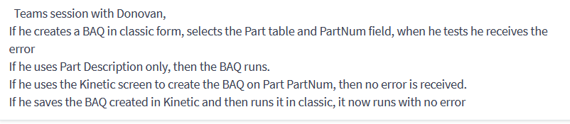 Additional context, old BAQs where Part.PartNum already exists in the BAQ work fine, no errors. If i add Part.PartNum to an existing BAQ, or create a new one as above, i get the error.