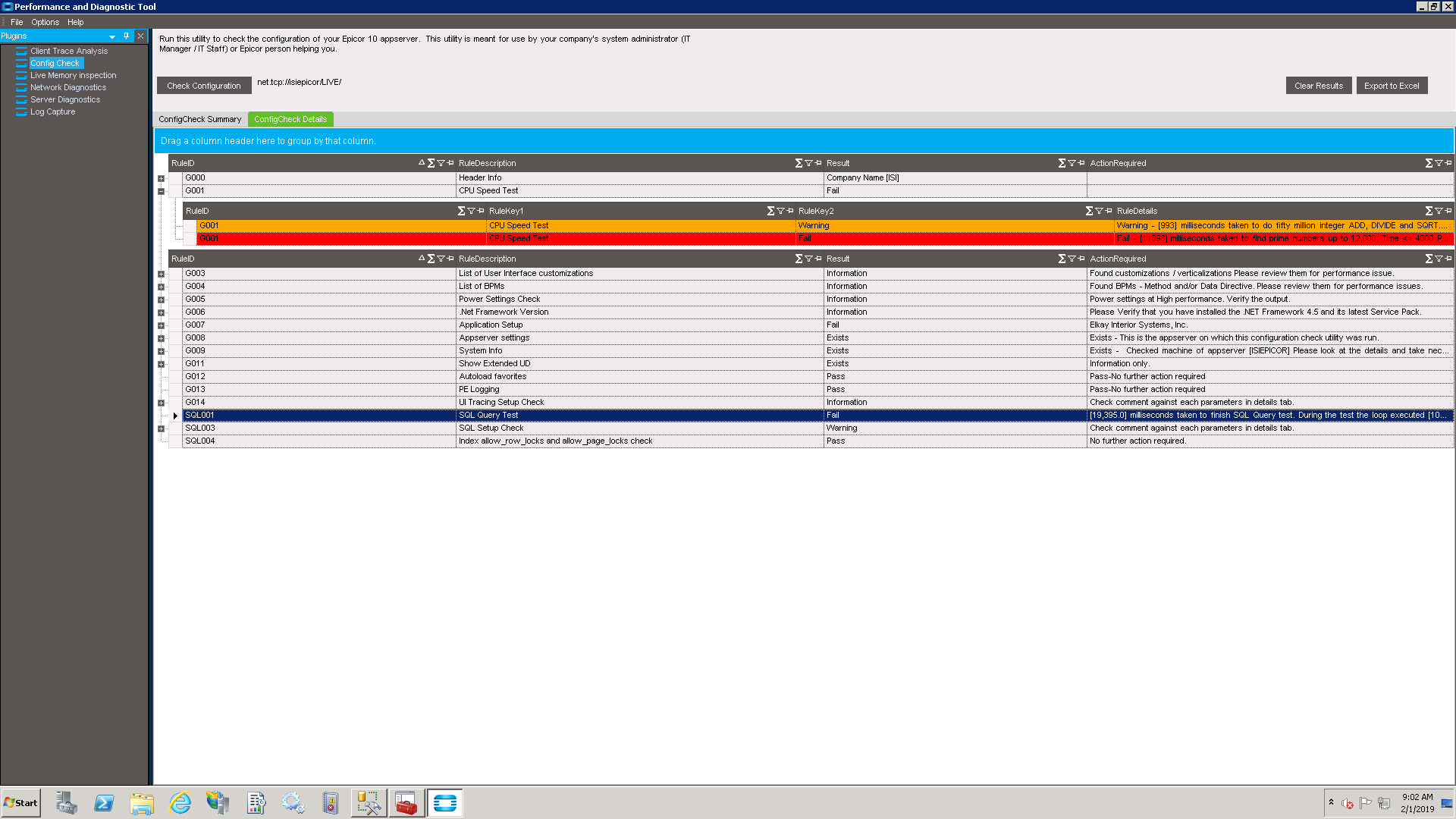 So, on Wednesday, my users started receiving the below error. We ended up having to reboot the (virtual) server to clear it up. Ever since the reboot, Epicor has been running extremely slow. I ran the PDT and received the terrible results below, but I’m not sure what to do with that information. Before the error on Wednesday, the PDT was passing everything and our SQL results was around 2,700-3,000ms. Where do I go from here?
