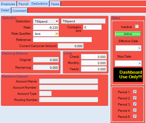 Do you have the payroll module in Epicor? When we used the epicor payroll module in E9, this is how i had them setup. The declining balance would also work, but we wanted it to be a fixed amount each week. The non-taxable portion would be established on the deduction setup screen. The deduction has to be negative since you’re adding it to the check.