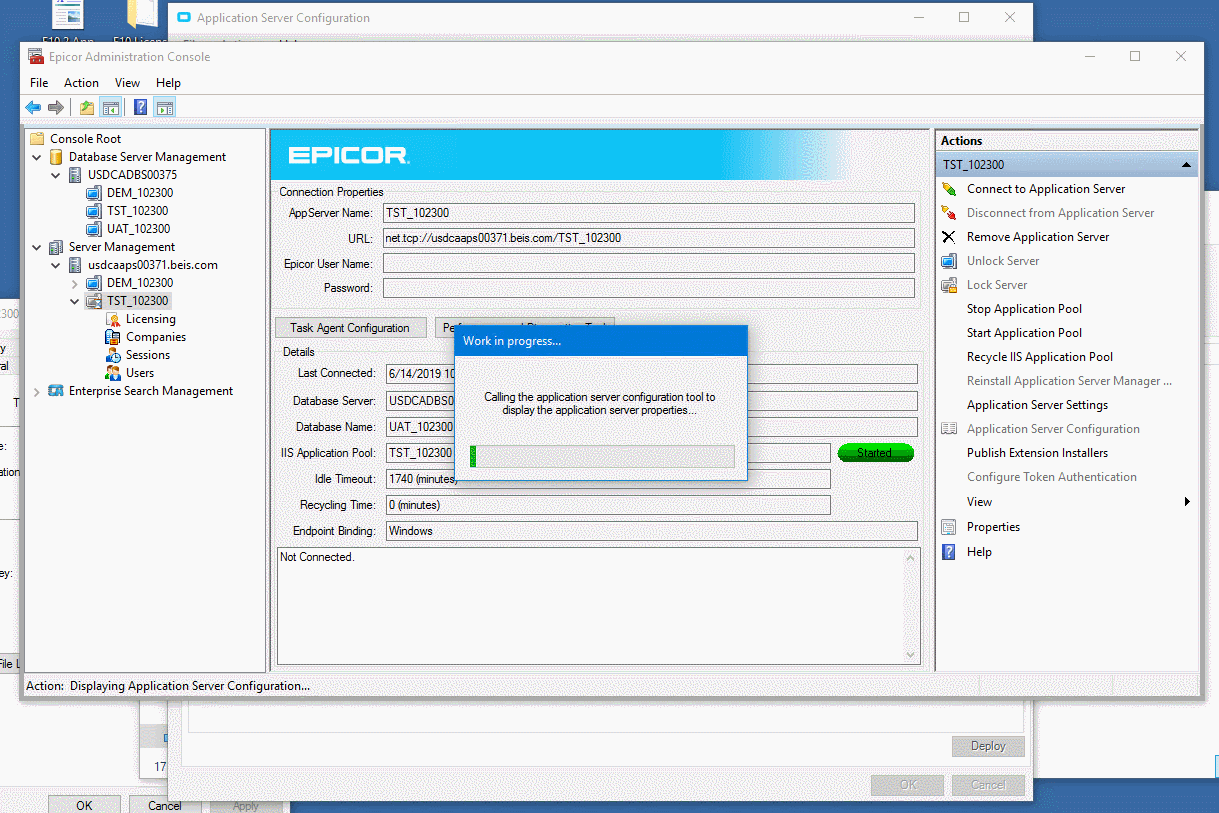 - Launching Application Server Configuration from EAC, makes a modal dialog box with the Work in Progress message, and launches the Application Server Configuration (ASC) program.