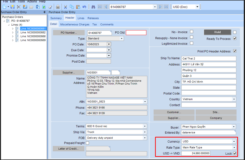 Then, I changed Currency to USD with a lock rate. And I changed the price of 4 lines.