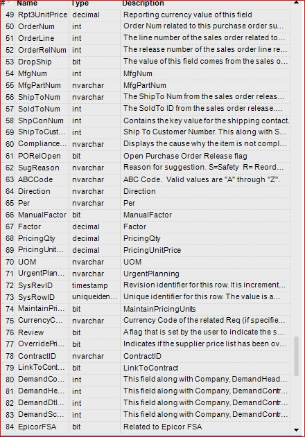 Also, when a suggestion becomes a purchase order (PO), it no longer shows up in the SugPoDtl table. Even if I have the creation date (CreatedOn), I’ll need to figure out how to compare it. My SQL skills are limited, but I can write it to UD tables as a secondary step, I suppose.