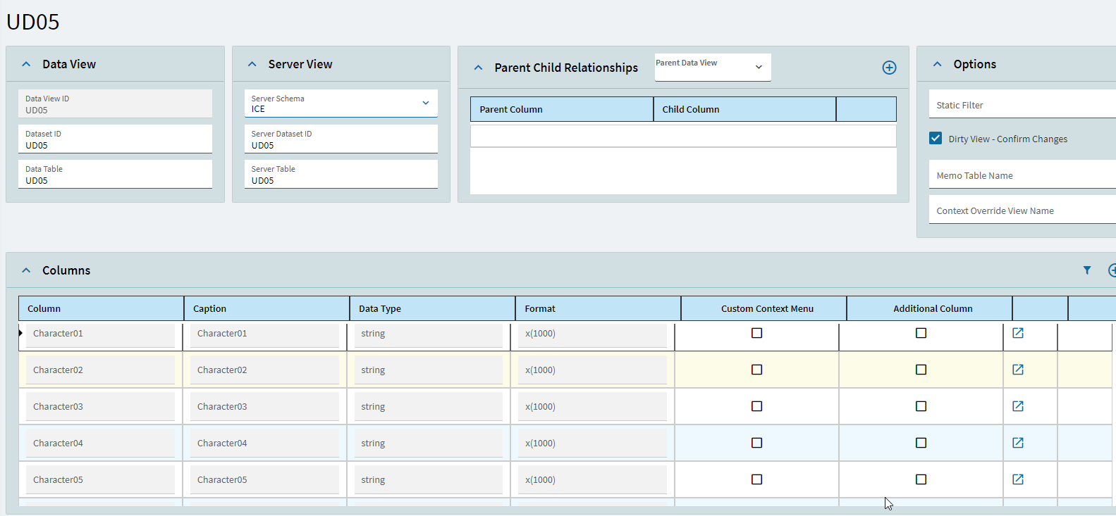 Anyway, the UD05 table is set to go, the baq looks to be working as expected ( I can manually populate UD05 with a suitable “key” to return a CustNum) , but I have fallen at the first hurdle in application studio: I cannot link a dataview to my UD table, and haven’t managed to find any examples here of it being done. Here’s what i have tried, but no columns appear: