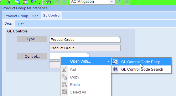 Right Click in the Control Field and select Open with ⦠-> GL Control Entry