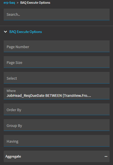 Thank you for the suggestion David! This works great. Now I’m trying to implement the same filters as before (using the WHERE List clauses I had set up for the previous ‘BAQ Grid’). Now that I’m populating the DataView/grid separately using rest-erp, being limited to the single “Where” textbox in BAQ Execute Options is becoming tricky.