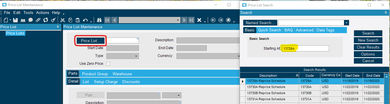 In Price List Maintenance, our price list codes are set up as our part number. When we click on the Price List button to search, we key in the part number in the box where it says Starting At and click search. The issue we are having is that it shows Price lists after that part number but not the one for the part number itself: