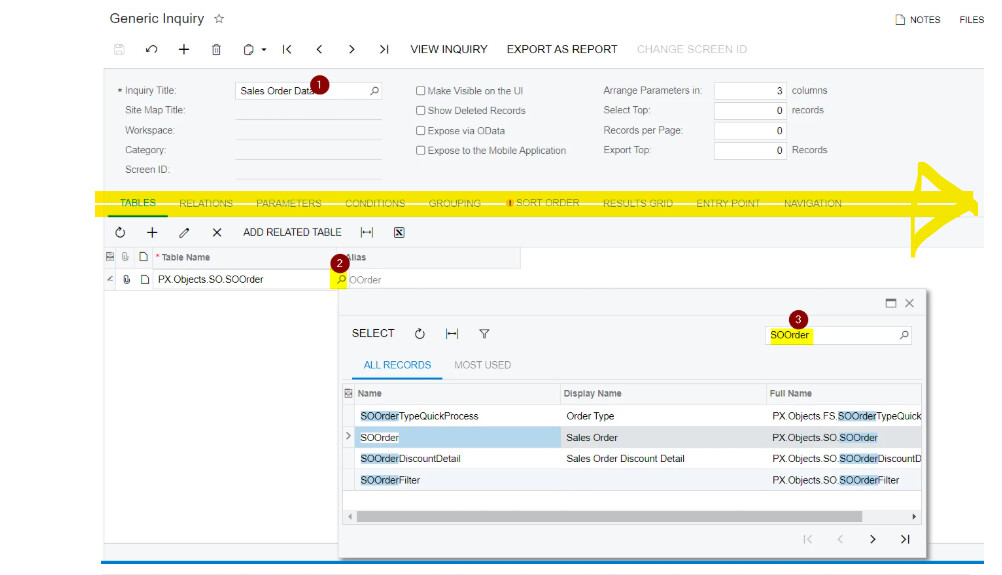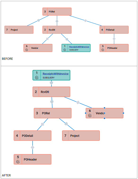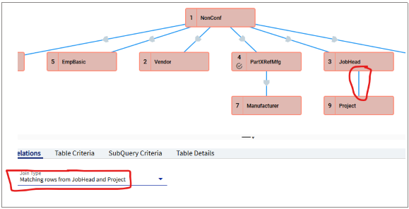 When first opening in the browser, tables are rearranged to fit better on the canvas graphically, disregarding the table order. In this example it looks like we’re starting with PORel but the actual first table (subquery) is at the bottom. Very confusing! I have also had my tables rearranged automatically while I was working on a BAQ.