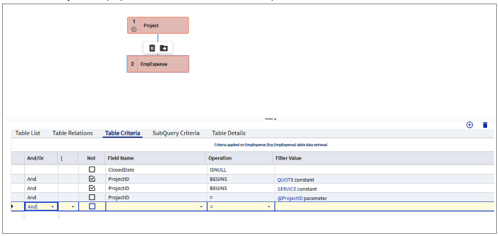 Sometimes the selected table is not as indicated. In the example below, EmpExpense is selected but the Table Criteria for Project is displayed. Have to close the BAQ and re-open it to resolve