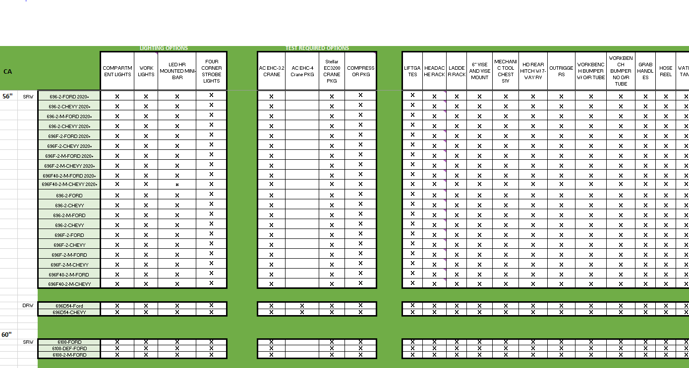 the “696” numbers are the service bodies that we mount onto chassis. The options across the top are all of the things that can get mounted on that service body. Do we need to create “std BOMs” for all of those option choices across the top, in order to pull in BOMs and Routing?
