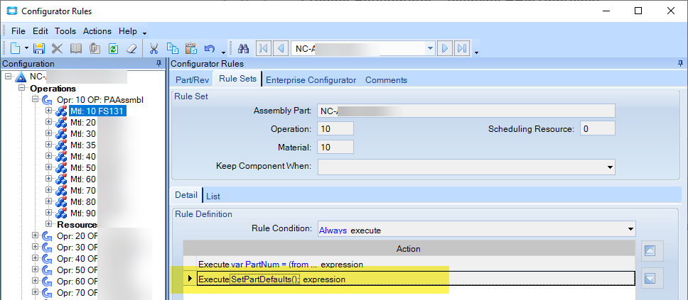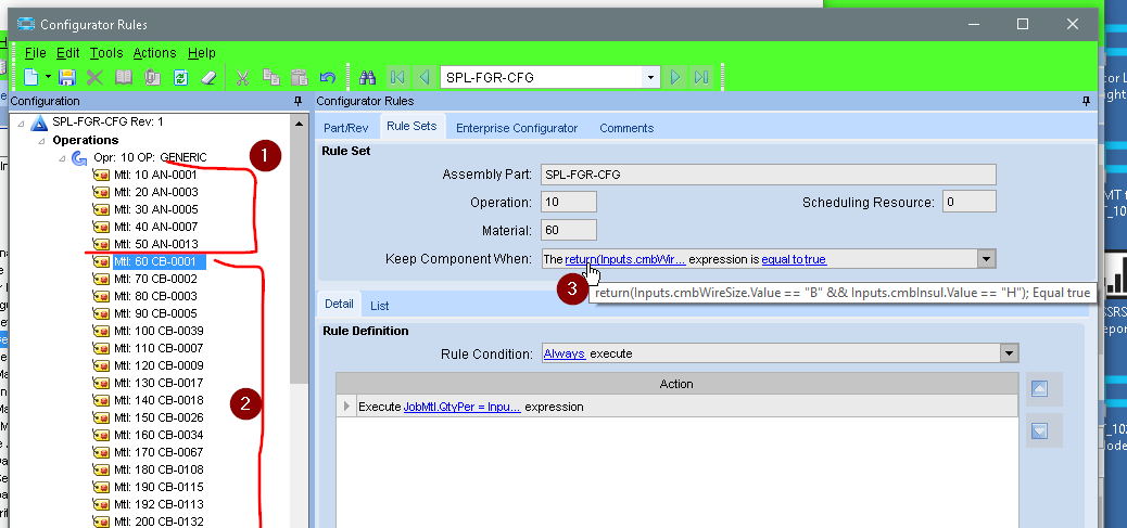 And from your MOM, it looks like you’re actually using the Super-BOM method (including all possible materials). In the Super BOM method, you pretty much just use Keep When rules, to include or exclude materials on the MOM, based on the users input…
