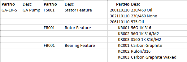 I have a pump, and it has three features, for sake of ease today. I think in designer I will need to provide dropdown list for each feature with the PartNo/Desc, to do the configuration. Here’s an example of data both in spreadsheet and in attempt to start configurator design. I made a method for the parent pump with placeholder feature partnos and then each feature has a choice, where user will pick one.