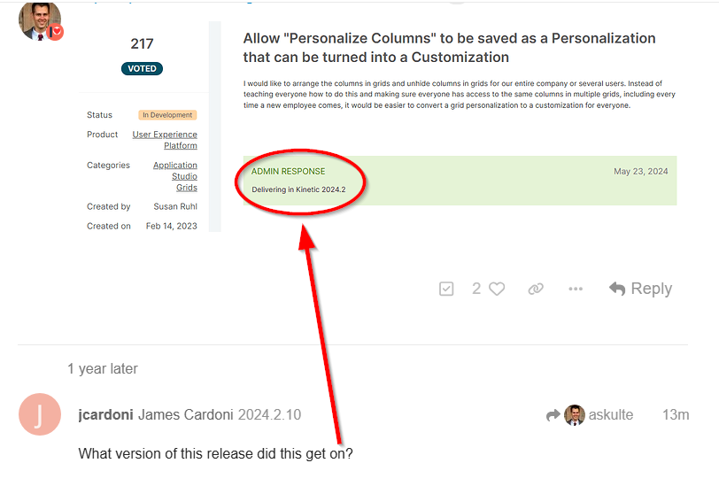 I’m also getting the (it seems like) auto-reply from the support agents that X ‘feature’ from the Classic UI is not available in Kinetic, and to enter yet another Ideas topic. Latest one is that the Kinetic Job Status Maintenance only allows us to firm 50 jobs at a time, while Classic can bring in all jobs.
