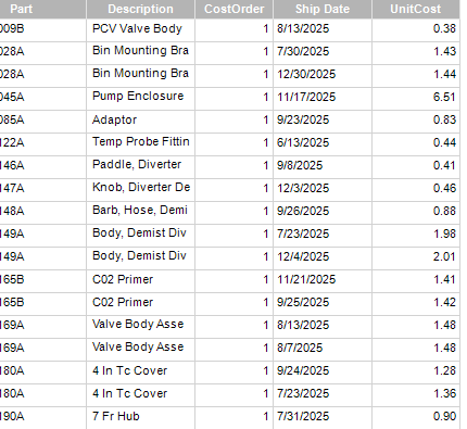 This should give you each time the part changed cost. This is rounded to 2 decimals, so there may be some duplicates due to rounding. However, you’re interested in the most recent change, but you should be able to get there from here.