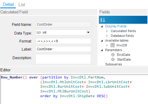 What this says is for every part/cost combination write a row_number. I ordered it by ShipDate Descending. So, for the latest date for the part/cost combination, it gets a 1, the next SAME part/cost combination will get a 2, the next SAME part/cost combination with get a 3, and so on. When the part/cost combination changes, it will go back to 1 and start over.
