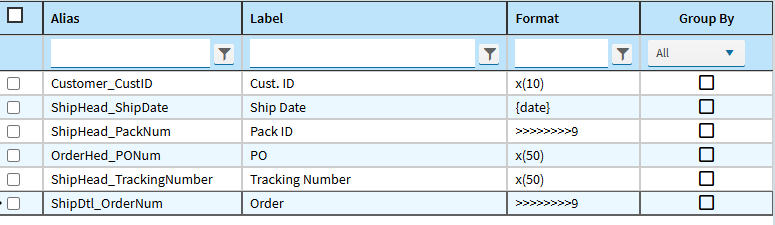 I’m having a hard time getting this BAQ to display properly. My goal is to be able to plug in a given date range and it will display all shipments for a specific customer and include the tracking #'s that were entered. Here’s the columns I’m trying to have populated but the system is coming back with incorrect PO #'s and Order #'s for given pack list #'s and tracking #'s. What would be wrong in my relations?