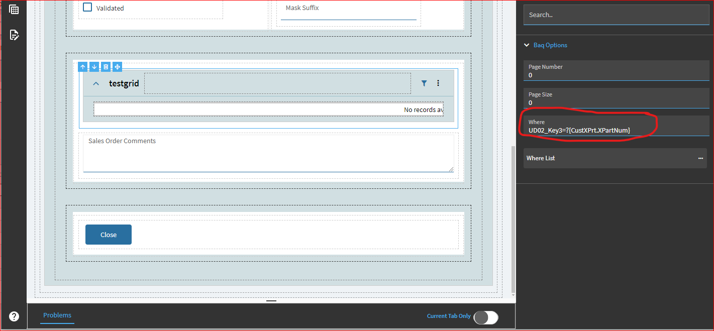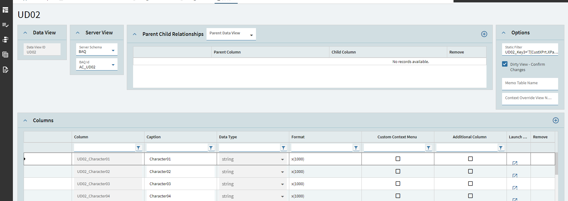 So far I successfully created a dataview and was easily able to pull the UD02 table into a grid used the grid options, but the filter I made isnt working to only pull data for the specific key that matches the customer part # that was selected. Also how do I pull only one row data from my dataview into a text field? I feel like the text field doesnt leave us with many options, so I am guessing I have to filter it then pull data somehow using the events? Or maybe a data rule but I feel like that is the wrong way. If anyone has a suggestion I would love a tip or two! Heres what I got so far: