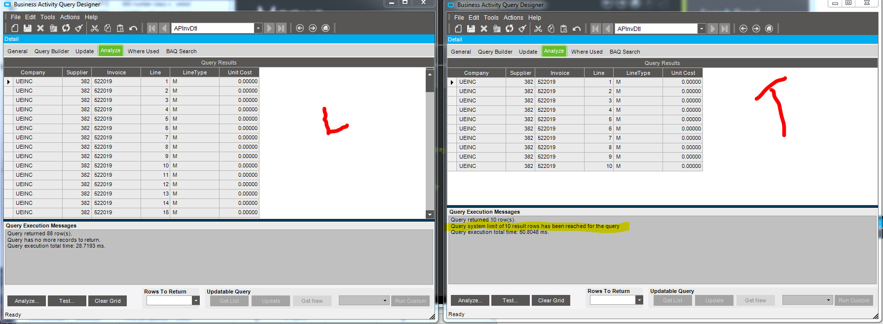 I’m seeing something curious today. I have a query on live which I copied to test. All it has is APInvDtl filtered by invoice number 522019. On live it shows 88 rows, on test it shows 10 rows. I have Rows to return = blank, both queries are Type: TopLevel with ResultSetRows: All