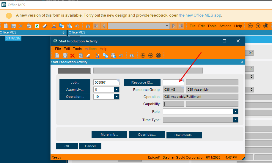 We were thinking about creating a Dies resrouce group, and attaching a specific resrouce in that group to the BOM. Then Update our Mobile App to make them āscanā the Resource ID at Clock In