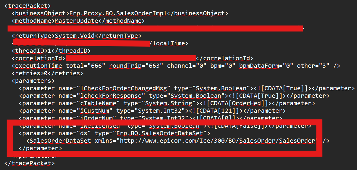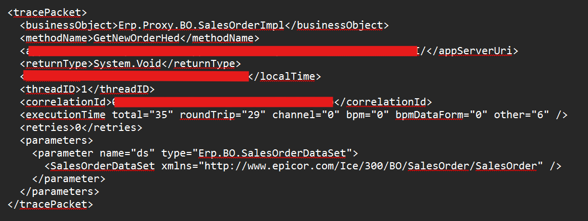 “GetNewOrderHed” is the method that is called to actually create the OrderHed record. As you can see, one of the parameters it is passing is the “SalesOrderDataSet”. In this DataSet, is the OrderHed data. Inside there, if you enable “Write Full DataSet” in the trace logging, you will see your field, and the data: