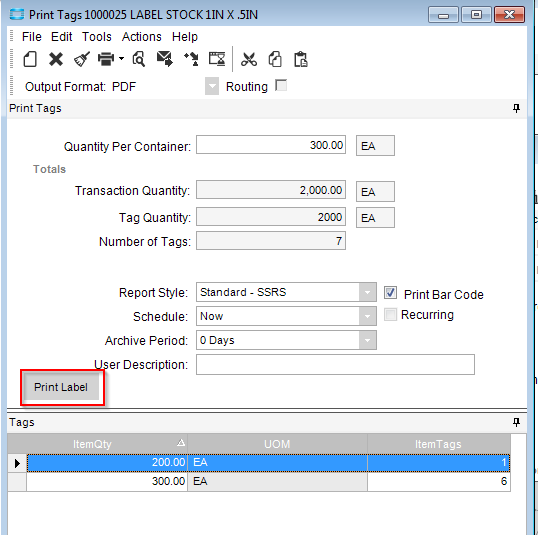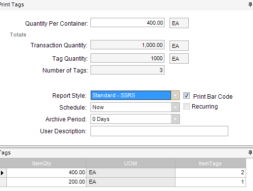 Thanks Chris. I want to use the “Print Tag” under Action from the Receipt Entry form since that has some of those functionalities added already. Seems that if I click on each line received, it knows the qty amount that was received. I can then specify how many qty per container and Epicor automatically create the rows correctly. Example, if I received 1000qty and specify 400 per container, it generate 2 rows. One row with qty 400 and 2 labels and second row with qty 200 and 1 label.